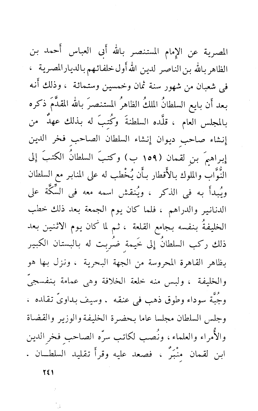 المصرية عَن الإِمَام الْمُسْتَنْصر بِاللَّه أَبى الْعَبَّاس أَحْمد بن الظَّاهِر بِاللَّه بن النَّاصِر لدين الله أول خلفائهم بالديار المصرية فِي شعْبَان من شهور سنة ثَمَان وَخمسين وسِتمِائَة وَذَلِكَ أَنه بعد ان بَايع السُّلْطَان الْملك الظَّاهِر الْمُسْتَنْصر بِاللَّه الْمُقدم ذكره بِالْمَجْلِسِ الْعَام قَلّدهُ السلطنة وَكتب لَهُ بذلك عهد من إنْشَاء صَاحب ديوَان إنْشَاء السُّلْطَان الصاحب فَخر الدّين إِبْرَاهِيم بن لُقْمَان وَكتب السُّلْطَان الْكتب إِلَى النواب والملوك بالأقطار بِأَن يخْطب لَهُ على المنابر مَعَ السُّلْطَان وَيبدأ بِهِ فِي الذّكر وينقش اسْمه مَعَه فِي السِّكَّة على الدَّنَانِير وَالدَّرَاهِم فَلَمَّا كَانَ يَوْم الْجُمُعَة بعد ذَلِك خطب الْخَلِيفَة بِنَفسِهِ بِجَامِع القلعة ثمَّ لما كَانَ يَوْم الِاثْنَيْنِ بعد ذَلِك ركب السُّلْطَان إِلَى خيمة ضربت لَهُ بالبستان الْكَبِير بِظَاهِر الْقَاهِرَة المحروسة من الْجِهَة البحرية وَنزل بهَا هُوَ والخليفة وَلبس مِنْهُ خلعة الْخلَافَة وهى عمامه بنفسجى وجبة سَوْدَاء وطوق ذهب فِي عُنُقه وَسيف بداوى تقلده وَجلسَ السُّلْطَان مَجْلِسا عَاما بِحَضْرَة الْخَلِيفَة والوزير والقضاة والأمراء وَالْعُلَمَاء وَنصب لكاتب سره الصاحب فَخر الدّين ابْن لُقْمَان مِنْبَر فَصَعدَ عَلَيْهِ وَقَرَأَ تَقْلِيد السُّلْطَان