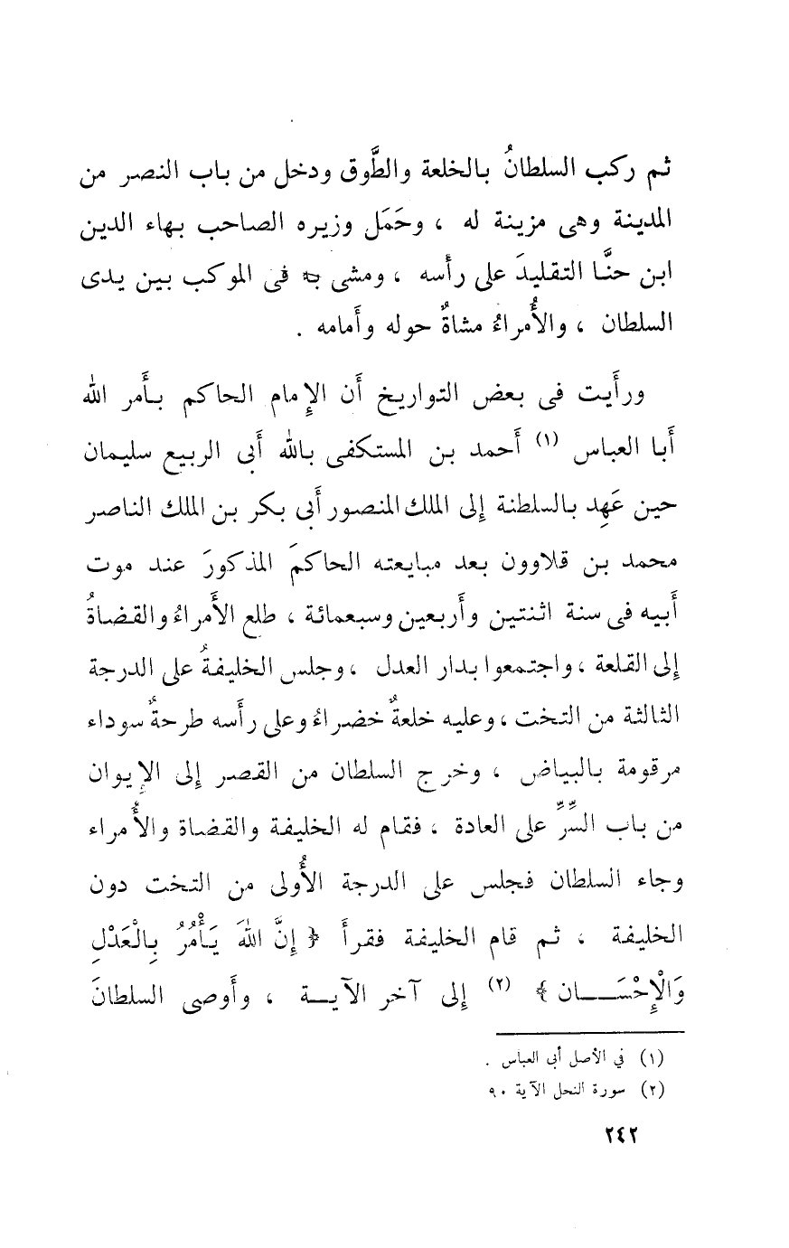 وَرَأَيْت فِي بعض التواريخ أَن الإِمَام الْحَاكِم بِأَمْر الله أَبَا الْعَبَّاس أَحْمد بن المستكفى بِاللَّه أَبى الرّبيع سُلَيْمَان حِين عهد بالسلطنة إِلَى الْملك الْمَنْصُور أَبى بكر بن الْملك النَّاصِر مُحَمَّد بن قلاوون بعد مبايعته الْحَاكِم الْمَذْكُور عِنْد موت أَبِيه فِي سنة اثْنَتَيْنِ وَأَرْبَعين وَسَبْعمائة طلع الْأُمَرَاء والقضاة إِلَى القلعة واجتمعوا بدار الْعدْل وَجلسَ الْخَلِيفَة على الدرجَة الثَّالِثَة من التخت وَعَلِيهِ خلعه خضراء وعَلى رَأسه طرحة سَوْدَاء مرقومة بالبياض وَخرج السُّلْطَان من الْقصر إِلَى الإيوان من بَاب السِّرّ على الْعَادة فَقَامَ لَهُ الْخَلِيفَة والقضاة والأمراء وَجَاء السُّلْطَان فَجَلَسَ على الدرجَة الأولى من التخت دون الْخَلِيفَة ثمَّ قَامَ الْخَلِيفَة فَقَرَأَ {إِن الله يَأْمر بِالْعَدْلِ وَالْإِحْسَان} إِلَى آخر الْآيَة وَأوصى السُّلْطَان