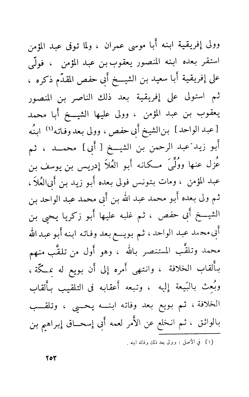 وَولي إفريقية ابْنه أَبَا مُوسَى عمرَان وَلما توفّي عبد الْمُؤمن أستقر بعده أبنه الْمَنْصُور يَعْقُوب بن عبد الْمُؤمن فولي على إفريقية أَبَا سعيد بن الشَّيْخ أبي حَفْص الْمُقدم ذكره ثمَّ أستولى على إفريقية بعد ذَلِك النَّاصِر بن الْمَنْصُور يَعْقُوب بن عبد الْمُؤمن وَولي عَلَيْهَا الشَّيْخ أَبَا مُحَمَّد عبد الْوَاحِد بن الشَّيْخ أبي حَفْص وَولي بعد وَفَاته أبنه أَبُو زيد عبد الرَّحْمَن بن الشَّيْخ أبي مُحَمَّد ثمَّ عزل عَنْهَا وَولي مَكَانَهُ أَبُو الْعلَا إِدْرِيس بن يُوسُف بن عبد الْمُؤمن وَمَات بتونس فولي بعده أَبُو زيد بن أبي الْعلَا ثمَّ ولي بعده أَبُو مُحَمَّد عبد الله بن أبي مُحَمَّد عبد الْوَاحِد بن الشَّيْخ أبي حَفْص ثمَّ غَلبه عَلَيْهَا ابو زَكَرِيَّا يحيى بن ابي مُحَمَّد عبد الْوَاحِد ثمَّ بُويِعَ بعد وَفَاته أبنه أَبُو عبد الله مُحَمَّد وتلقب الْمُسْتَنْصر بِاللَّه وَهُوَ أول من تلقب مِنْهُم بألقاب الْخلَافَة وأنتهى أمره إِلَى أَن بُويِعَ لَهُ بِمَكَّة وَبعث بالبيعه إِلَيْهِ وَتَبعهُ أعقابه فِي التلقيب مِنْهُم بألقاب الْخلَافَة ثمَّ بُويِعَ بعد وَفَاته أبنه يحيى وتلقب بالواثق ثمَّ أَنْخَلِع عَن الْأَمر لِعَمِّهِ أبي إِسْحَاق إِبْرَاهِيم بن