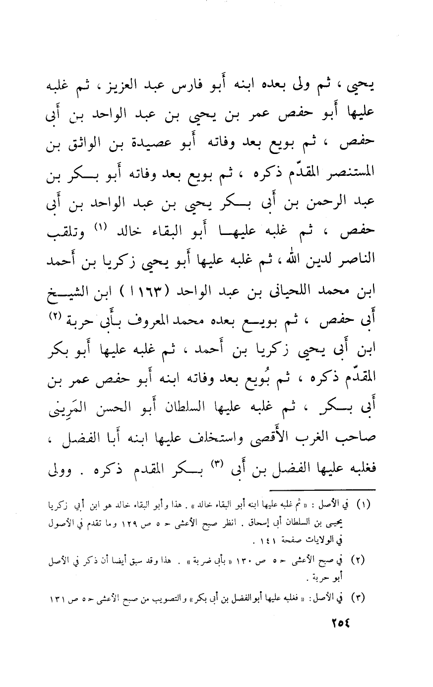 يحيى ثمَّ ولي بعده أبنه أَبُو فَارس عبد الْعَزِيز ثمَّ غَلبه عَلَيْهَا أَبُو حَفْص عمر بن يحيى بن عبد الْوَاحِد بن أبي حَفْص ثمَّ بُويِعَ بعد وَفَاته أَبُو عصيدة بن الواثق بن الْمُسْتَنْصر الْمُقدم ذكره ثمَّ بُويِعَ بعد وَفَاته أَبُو بكر بن عبد الرَّحْمَن بن أبي بكر يحيى بن عبد الْوَاحِد بن أبي حَفْص ثمَّ غَلبه عَلَيْهَا أَبُو الْبَقَاء خَالِد وتلقب النَّاصِر لدين الله ثمَّ غَلبه عَلَيْهَا أَبُو يحيى زَكَرِيَّا بن أَحْمد أبن مُحَمَّد اللحياني أبن عبد الْوَاحِد أبن الشَّيْخ أبي حَفْص ثمَّ بُويِعَ بعده مُحَمَّد الْمَعْرُوف بِأبي حَرْبَة أبن أبي يحيى زَكَرِيَّا بن أَحْمد ثمَّ غَلبه عَلَيْهَا أَبُو بكر الْمُقدم ذكره ثمَّ بُويِعَ بعد وَفَاته أبنه أَبُو حَفْص عمر بن أبي بكر ثمَّ غَلبه عَلَيْهَا السُّلْطَان أَبُو حسن الموريني صَاحب الغرب الْأَقْصَى وأستخلف عَلَيْهَا أبنه أَبَا الْفضل فغلبه عَلَيْهَا الْفضل بن أبي بكر الْمُقدم ذكره وَولي