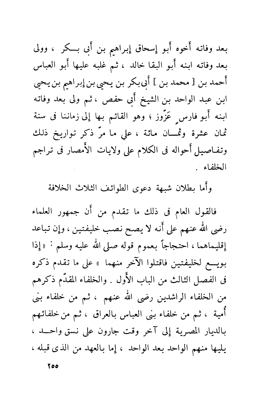 فَالْقَوْل الْعَام فِي ذَلِك مَا تقدم من أَن جُمْهُور الْعلمَاء رَضِي الله عَنْهُم على أَنه لَا يَصح نصب خليفتين وَأَن تبَاعد أقليماهما وأحتجاجا بِعُمُوم قَوْله صلى الله عَلَيْهِ وَسلم إِذا بُويِعَ لخليفتين فَاقْتُلُوا الآخر مِنْهُم على مَا تقدم ذكره فِي الْفَصْل الثَّالِث من الْبَاب الأول وَالْخُلَفَاء الْمُقدم ذكرهم من الْخُلَفَاء الرَّاشِدين رَضِي الله عَنْهُم ثمَّ من خلفاء بني أُمِّيّه ثمَّ من خلفاء بني الْعَبَّاس بالعراق ثمَّ من خلفاءهم بالديار المصرية إِلَى آخر وَقت جارون على نسق وَاحِد يَليهَا ى مِنْهُم الْوَاحِد بعد الْوَاحِد إِمَّا بالعهد من الَّذِي قبله