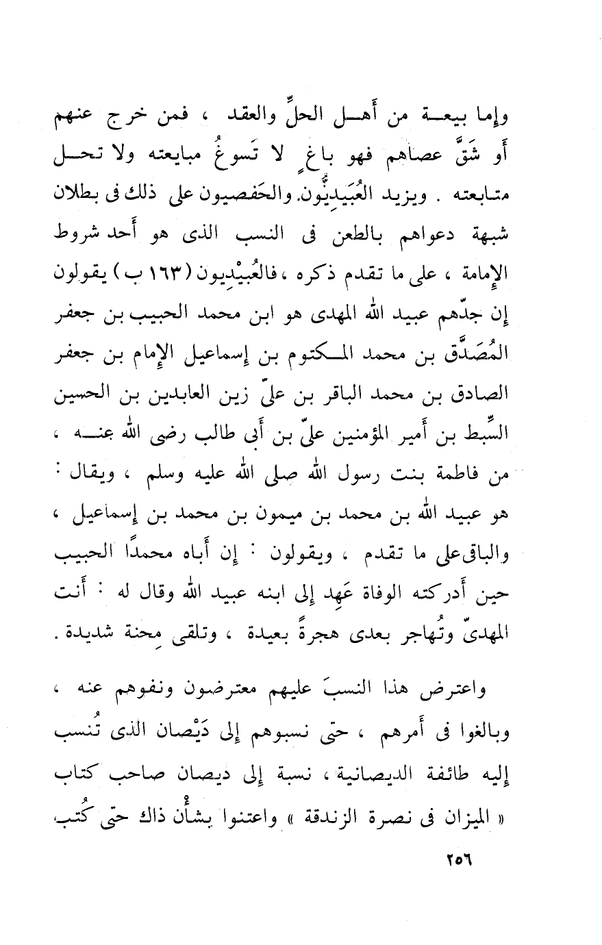 وَإِمَّا بيعَة من أهل الْحل وَالْعقد فَمن خرج عَنْهُم أَو شقّ عصاهم فَهُوَ بَاغ لَا تسوغ مبايعته ولاتحل مُتَابَعَته وَيزِيد العبيديون والحفصيون على ذَلِك فِي بطلَان شُبْهَة دَعوَاهُم بالطعن فِي النّسَب الَّذِي هوأحد شُرُوط الإماميه على مَا تقدم ذكره فالعبيديون يَقُولُونَ إِن جدهم عبيد الله المهدى هُوَ ابْن مُحَمَّد الحبيب بن جَعْفَر الْمُصدق بن مُحَمَّد المكتوم بن إِسْمَاعِيل الإِمَام بن جَعْفَر الصَّادِق بن مُحَمَّد الباقر بن على زين العابدين بن الْحُسَيْن السبط بن أَمِير الْمُؤمنِينَ على بن أَبى طَالب رضى الله عَنهُ من فَاطِمَة بنت رَسُول الله صلى الله عَلَيْهِ وَسلم وَيُقَال هُوَ عبيد الله بن مُحَمَّد بن مَيْمُون بن مُحَمَّد بن إِسْمَاعِيل والباقى على مَا تقدم وَيَقُولُونَ إِن أَبَاهُ مُحَمَّدًا الحبيب حِين أَدْرَكته الْوَفَاة عهد إِلَى ابْنه عبيد الله وَقَالَ لَهُ أَنْت المهدى وتهاجر بعدى هِجْرَة بعيدَة وتلقى محنة شَدِيدَة