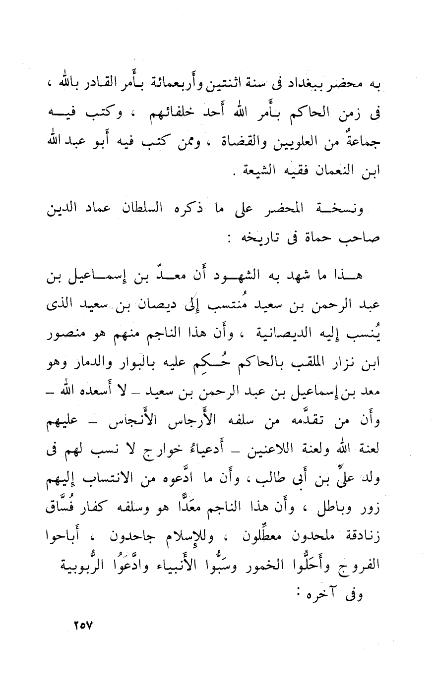بِهِ محْضر بِبَغْدَاد فِي سنة اثْنَتَيْنِ وَأَرْبَعمِائَة بِأَمْر الْقَادِر بِاللَّه فِي زمن الْحَاكِم بِأَمْر الله أحد خلفائهم وَكتب فِيهِ جمَاعَة من العلويين والقضاة وَمِمَّنْ كتب فِيهِ أَبُو عبد الله ابْن النُّعْمَان فَقِيه الشِّيعَة