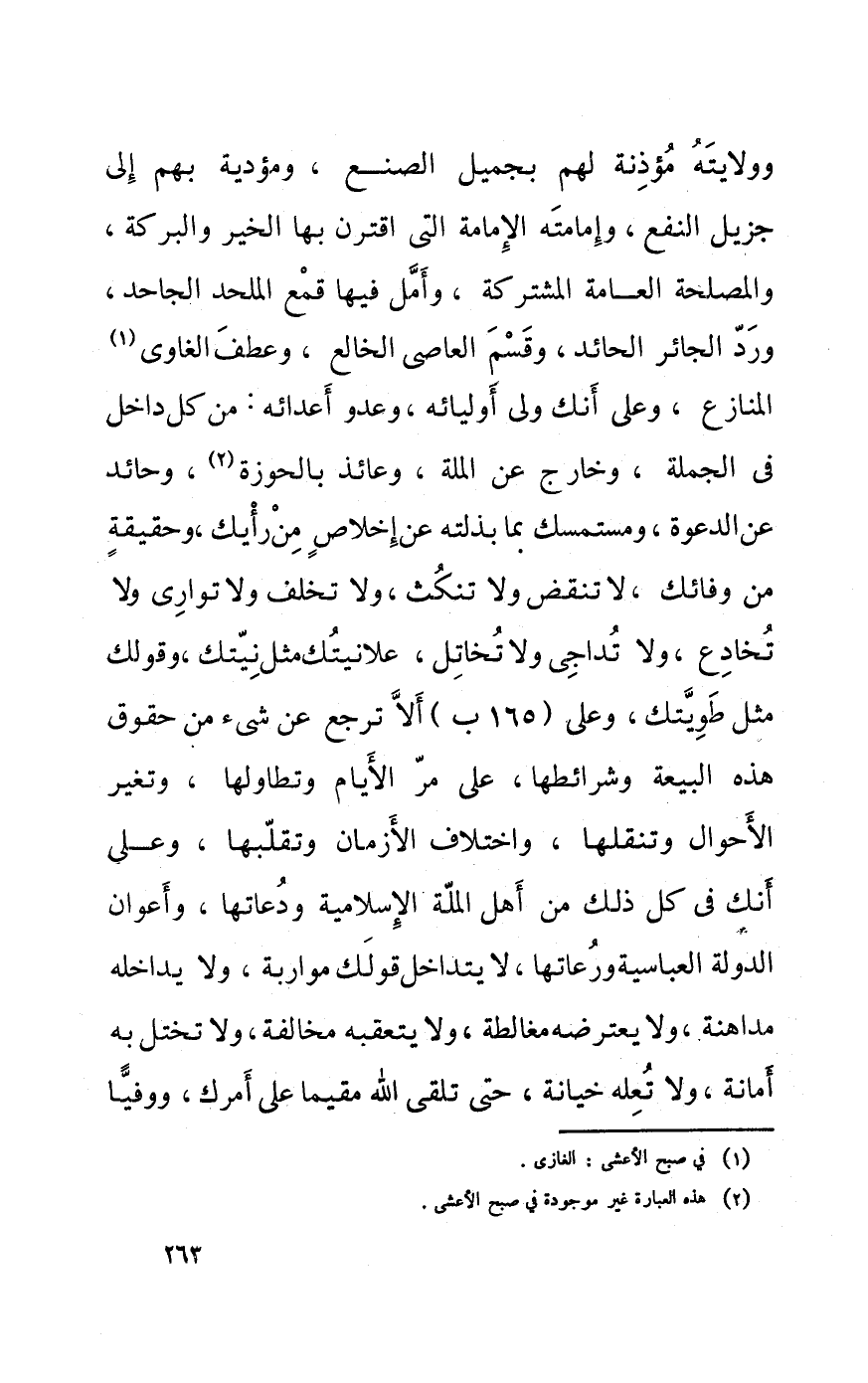 وولايته مؤذنة لَهُم بجميل الصنع ومؤدية بهم إِلَى جزيل النَّفْع وإمامته الْإِمَامَة الَّتِى اقْترن بهَا الْخَيْر وَالْبركَة والمصلحة الْعَامَّة الْمُشْتَركَة وأمل فِيهَا قمع الملحد الجاحد ورد الجائر الحائد وَقسم العاصى الخالع وَعطف الغاوى المنازع وعَلى أَنَّك ولى أوليائه وعدو أعدائه من كل دَاخل فِي الْجُمْلَة وخارج عَن الْملَّة وعائذ بالحوزة وحائد عَن الدعْوَة ومستمسك بِمَا بذلته عَن إخلاص من رَأْيك وَحَقِيقَة من وفائك لاتنقض وَلَا تنكث وَلَا تخلف وَلَا توارى وَلَا تخادع وَلَا تداجى وَلَا تخاتل علانيتك مثل نيتك وقولك مثل طويتك وعَلى الا ترجع عَن شَيْء من حُقُوق هَذِه الْبيعَة وشرائطها على مر الْأَيَّام وتطاولها وَتغَير الْأَحْوَال وتنقلها وَاخْتِلَاف الْأَزْمَان وَتَقَلُّبهَا وعَلى أَنَّك فِي كل ذَلِك من أهل الْملَّة الإسلامية ودعاتها وَأَعْوَان الدولة العباسية ورعاته الايتداخل قَوْلك مواربه وَلَا يداخله مداهنة وَلَا يَعْتَرِضهُ مغالطة ولايتعقبه مُخَالفَة وَلَا تختل بِهِ أَمَانه وَلَا تعله خِيَانَة حَتَّى تلقى الله مُقيما على أَمرك ووفيا