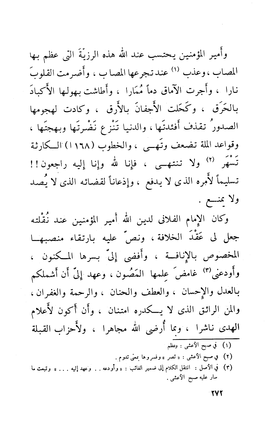 وامير الْمُؤمنِينَ يحْتَسب عِنْد الله هَذِه الرزيه الَّتِي عظم بهَا الْمُصَاب وعذب عِنْد تجرعها الْمُصَاب واضرمت الْقُلُوب نَارا واجرت الاماق دَمًا ممارا واطاشت بهولها الاكباد بالحرق وكحلت الاجفان بالارق وكادت لهجومها الصُّدُور تقذف افئدتها وَالدُّنْيَا تنْزع نضرتها وبهجتها وقواعد المله تضعف وتهى والخطوب 168 الكارثه تسهر وَلَا تَنْتَهِي فانا لله وانا اليه رَاجِعُون تَسْلِيمًا لامره الَّذِي لايدفع واذعانا لقضائه الَّذِي لايصد ولايمنع
