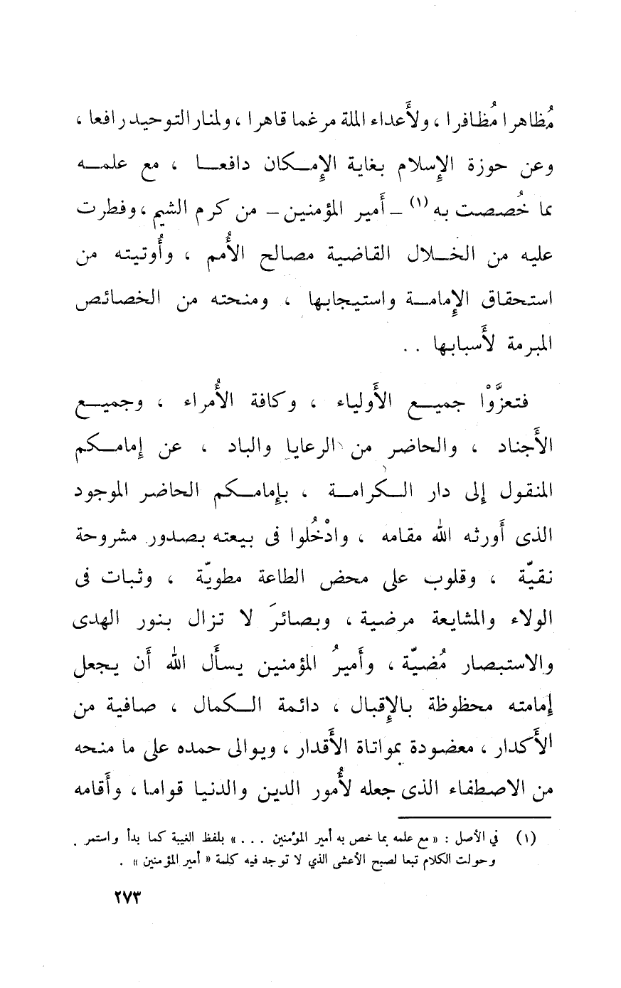 فتعزوا جَمِيع الاولياء وكافة الامراء وَجَمِيع الاجناد والحاضر من الرعايا والباد عَن امامكم الْمَنْقُول الى دَار الْكَرَامَة بامامكم الْحَاضِر الْمَوْجُود الَّذِي اورثه الله مقَامه وادخلوا فِي بيعَته بصدور مشروحه نقيه وَقُلُوب على مَحْض الطاعه مطويه وثبات فِي الْوَلَاء والمشايعة مرضيه وبصائر لَا تزَال بِنور الْهدى والاستبصار مضيه وامير الْمُؤمنِينَ يسال الله ان يَجْعَل امامته محظوظه بالاقبال دائمه الْكَمَال صافيه من الاكدار معضوضه بمواتاه الاقدار ويوالى حَمده على مَا منحه من الاصطفاء الَّذِي جعله لامور الدّين وَالدُّنْيَا قواما واقامه