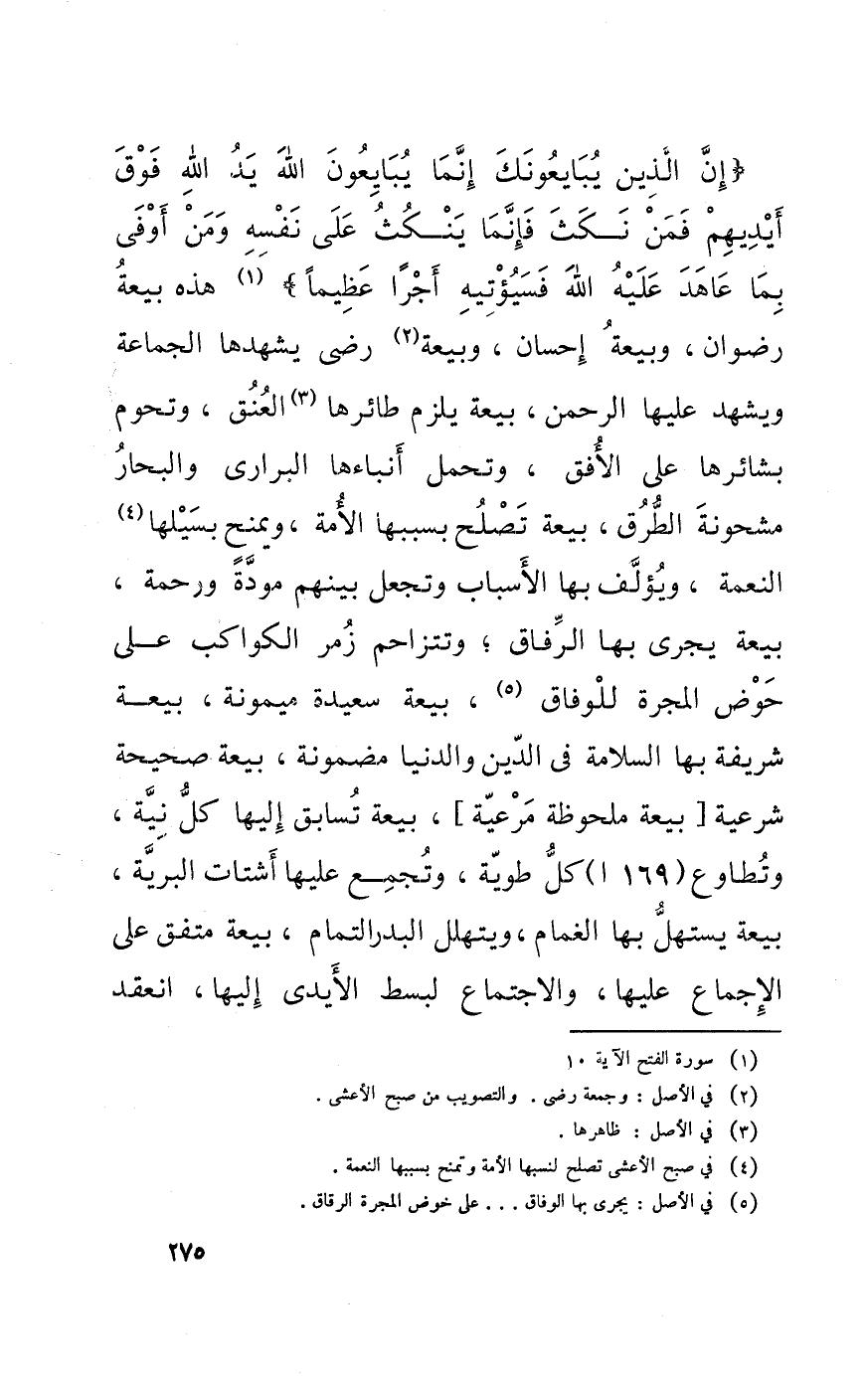 {إِن الَّذين يُبَايعُونَك إِنَّمَا يبايعون الله يَد الله فَوق أَيْديهم فَمن نكث فَإِنَّمَا ينْكث على نَفسه وَمن أوفى بِمَا عَاهَدَ عَلَيْهِ الله فسيؤتيه أجرا عَظِيما} هَذِه بَيْعه رضوَان وَبيعه احسان وَبيعه يشهدها الجماعه وَيشْهد عَلَيْهَا الرَّحْمَن بَيْعه يلْزم طائرها الْعُنُق وتحوم بشائرها على الافق وَتحمل انباءها البراري والبحار مشحونه الطّرق بَيْعه تصلح بِسَبَبِهَا الامه ويمنح بسيلها النعمه ويؤلف بهَا الْأَسْبَاب وَتجْعَل بَينهم مودرة وَرَحْمَة بيعَة يجْرِي بهَا الرفاق وتتزاحم زمر الْكَوَاكِب على حَوْض المجره للوفاق بَيْعه سعيده ميمونه بَيْعه شريفه بهَا السلامه فِي الدّين وَالدُّنْيَا مضمونه بَيْعه صَحِيحه شرعيه بَيْعه ملحوظه مرعيه بَيْعه تسابق اليها كل نيه وتطاوع 169 كل طويه وَتجمع عَلَيْهَا اشتات البريه بَيْعه يستهل بهَا الْغَمَام ويتهلل الْبَدْر التَّمام بَيْعه مُتَّفق على الاجماع عَلَيْهَا والاجتماع لبسط الايدى اليها انْعَقَد