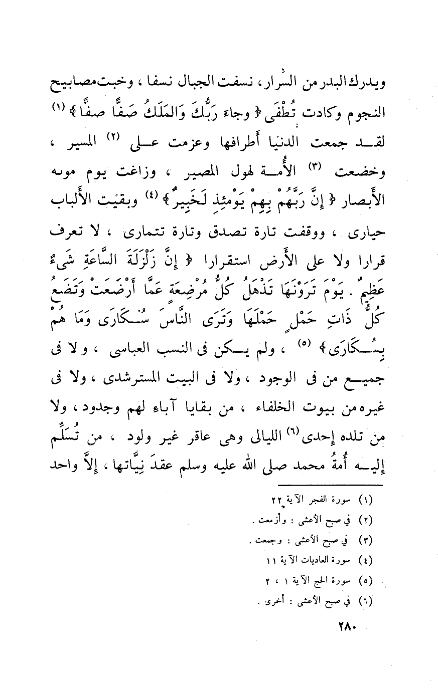 وَيدْرك الْبَدْر من السرَار نسفت الْجبَال نسفا وخبت مصابيح النُّجُوم وكادت تطفى {وَجَاء رَبك وَالْملك صفا صفا} لقد جمعت الدُّنْيَا أطرافها وعزمت على الْمسير وخضعت الْأمة لهول الْمصير وزاغت يَوْم مَوته الْأَبْصَار {إِن رَبهم بهم يَوْمئِذٍ لخبير} وَبقيت الْأَلْبَاب حيارى ووقفت تَارَة تصدق وَتارَة تتمارى لَا تعرف قرارا وَلَا على الأَرْض استقرارا {إِن زَلْزَلَة السَّاعَة شَيْء عَظِيم يَوْم ترونها تذهل كل مُرْضِعَة عَمَّا أرضعت وتضع كل ذَات حمل حملهَا وَترى النَّاس سكارى وَمَا هم بسكارى} وَلم يكن فِي النّسَب العباسي وَلَا فِي جَمِيع من فِي الْوُجُود وَلَا فِي الْبَيْت المسترشدي وَلَا فِي غَيره من بيُوت الْخُلَفَاء من بقايا آبَاء لَهُم وجدود وَلَا من تلده إِحْدَى اللَّيَالِي وَهِي عَاقِر غير ولود من تسلم إِلَيْهِ أمة مُحَمَّد صلى الله عَلَيْهِ وَسلم عقد نياتها إِلَّا وَاحِد