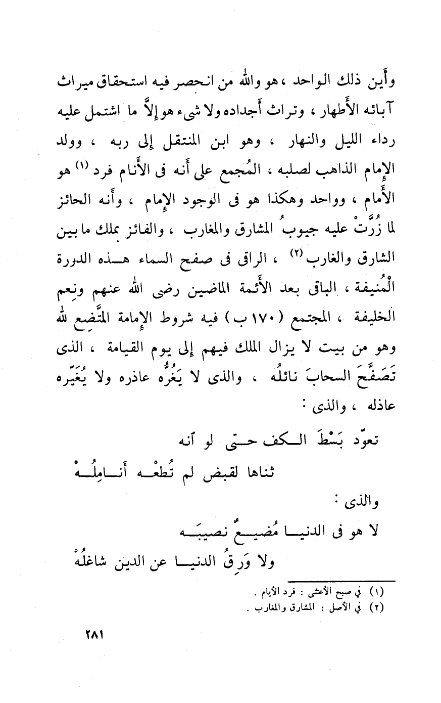 وَأَيْنَ ذَلِك الْوَاحِد هُوَ وَالله من انحصر فِيهِ اسْتِحْقَاق مِيرَاث آبَائِهِ الْأَطْهَار وتراث أجداده وَلَا شئ هُوَ إِلَّا مَا اشْتَمَل عَلَيْهِ رِدَاء اللَّيْل وَالنَّهَار وَهُوَ ابْن الْمُنْتَقل الى ربه وَولد الإِمَام الذَّاهِب لصلبه الْمجمع على أَنه فِي الْأَمَام فَرد هُوَ الْأَمَام وَوَاحِد وَهَكَذَا هُوَ فِي الْوُجُود الإِمَام وانه الْحَائِز لما زرت عَلَيْهِ جُيُوب الْمَشَارِق والمغارب والفائز بِملك مَا بَين الشارق وَالْغَارِب الراقي فِي صفح السَّمَاء هَذِه الدورة المنيفة الْبَاقِي بعد الْأَئِمَّة الماضين رَضِي الله عَنْهُم وَنعم الْخَلِيفَة الْمُجْتَمع فِيهِ شُرُوط الْإِمَامَة المتضع لله وَهُوَ من بَيت لَا يزَال الْملك فيهم الى يَوْم الْقِيَامَة الَّذِي تصفح السَّحَاب نائله وَالَّذِي لَا يغره عاذره وَلَا يُغَيِّرهُ عاذله وَالَّذِي ... تعود بسط الْكَفّ حَتَّى لَو انه ... ثناها لقبض لم تطعه أنامله ... وَالَّذِي ... لَا هُوَ فِي الدُّنْيَا مضيع نصِيبه ... وَلَا ورق الدُّنْيَا عَن الدّين شاغله ...
