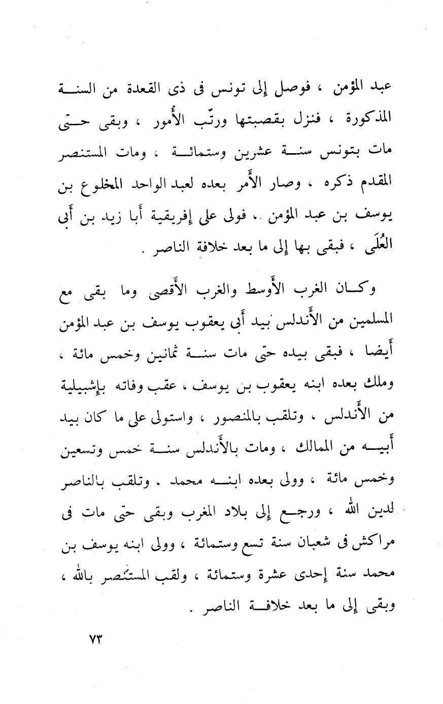 وَكَانَ الغرب الْأَوْسَط والغرب الْأَقْصَى وَمَا بقى مَعَ الْمُسلمين من الأندلس بيد أَبى يَعْقُوب يُوسُف بن عبد الْمُؤمن أَيْضا فبقى بِيَدِهِ حَتَّى مَاتَ سنة ثَمَانِينَ وَخمْس مائَة وَملك بعده ابْنه يَعْقُوب بن يُوسُف عقب وَفَاته بإشبيلية من الإندلس وتلقب بالمنصور وَاسْتولى على مَا كَانَ بيد أَبِيه من الممالك وَمَات بالأندلس سنة خمس وَتِسْعين وَخمْس مائَة وَولى بعده ابْنه مُحَمَّد وتلقب بالناصر لدين الله وَرجع إِلَى بِلَاد الْمغرب وبقى حَتَّى مَاتَ فِي مراكش فِي شعْبَان سنة تسع وسِتمِائَة وَولى ابْنه يُوسُف بن مُحَمَّد سنة إِحْدَى عشرَة وسِتمِائَة ولقب الْمُسْتَنْصر بِاللَّه وبقى إِلَى مَا بعد خلَافَة النَّاصِر