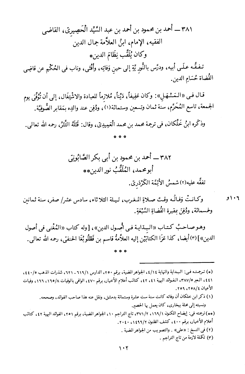 381 - أحمد بن محمود بن أحمد بن عبد السّيّد الحصيرىّ، القاضى الفقيه، الإمام، ابن العلاّمة جمال الدين و كان يلقّب نظام الدين *