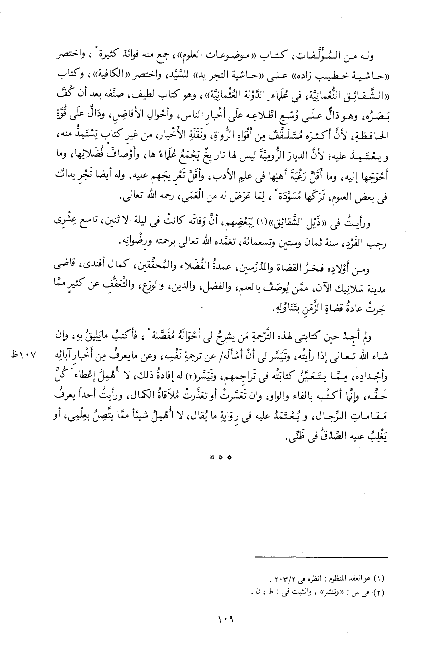109 و له من المؤلّفات، كتاب «موضوعات العلوم»، جمع منه فوائد كثيرة، و اختصر «حاشية خطيب زاده» على «حاشية التجريد» للسّيّد، و اختصر «الكافية»، و كتاب «الشّقائق النّعمانيّة، فى علماء الدّولة العثمانيّة»، و هو كتاب لطيف، صنّفه بعد أن كفّ بصره، و هو دالّ على وسع اطّلاعه على أخبار الناس، و أحوال الأفاضل، و دالّ على قوّة الحافظة، لأنّ أكثره متلقّف من أفواه الرّواة، و نقلة الأخبار، من غير كتاب يستمدّ منه، و يعتمد عليه؛ لأنّ الديار الرّوميّة ليس لها تاريخ يجمع علماءها، و أوصاف فضلائها، و ما أحوجها إليه، و ما أقلّ رغبة أهلها فى علم الأدب، و أقلّ تعريجهم عليه. و له أيضا تجريدات فى بعض العلوم، تركها مسوّدة، لما عرض له من العمى، رحمه اللّه تعالى.