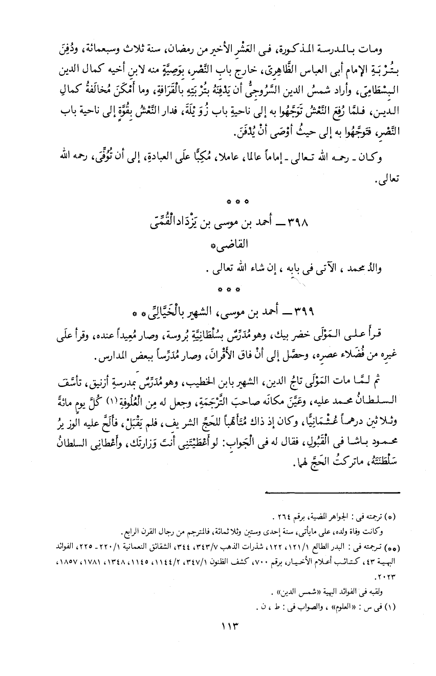 **) ترجمته فى: البدر الطالع 1/ 121، 122، شذرات الذهب 7/ 343، 344، الشقائق النعمانية 1/ 220 - 225، الفوائد البهية 43، كتائب أعلام الأخيار، برقم 700، كشف الظنون 1/ 347، 2/ 1144، 1145، 1348، 1781، 1857، 2023. و لقبه فى الفوائد البهية «شمس الدين».