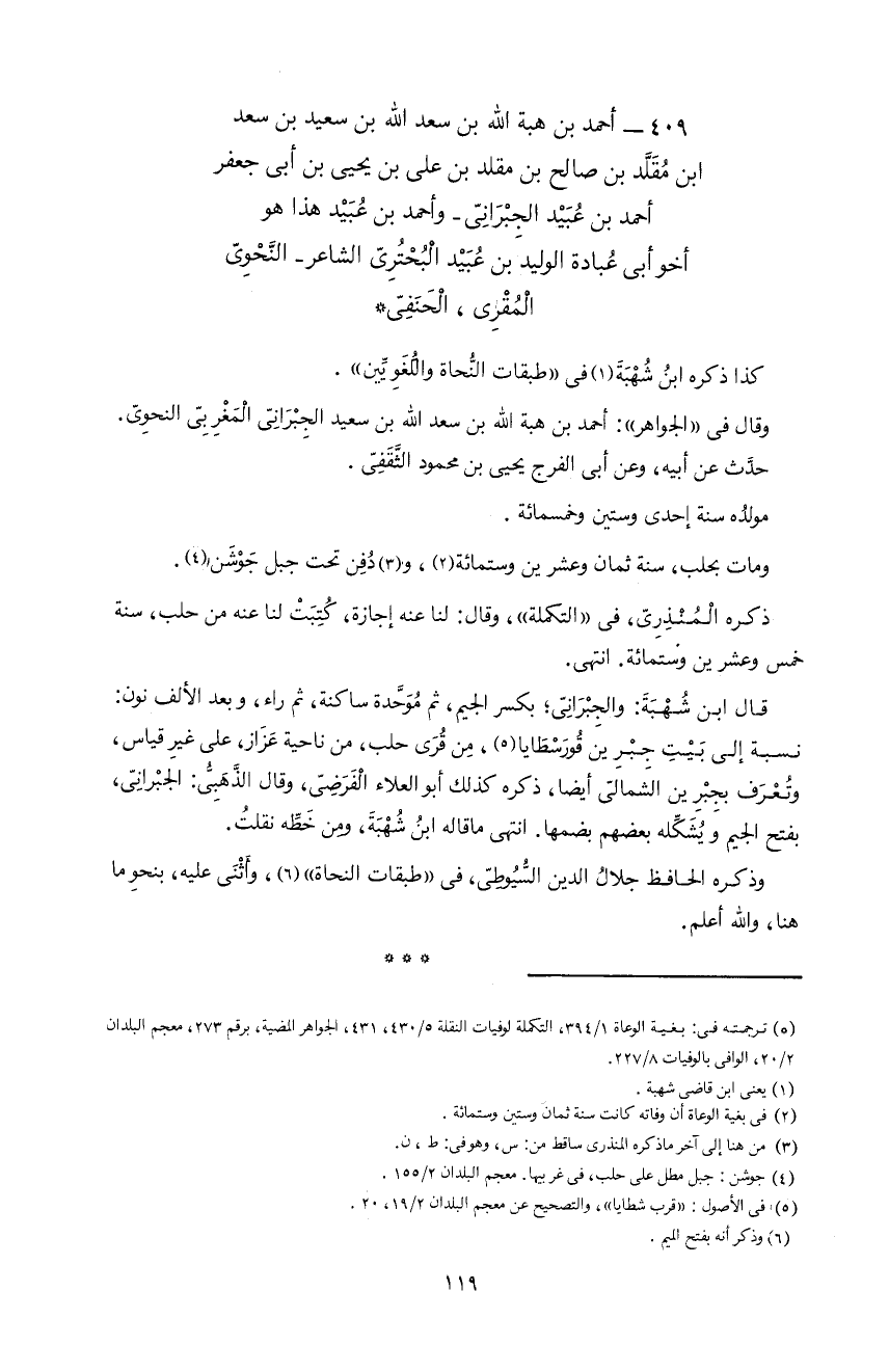 409 - أحمد بن هبة اللّه بن سعد اللّه بن سعيد بن سعد ابن مقلّد بن صالح بن مقلد بن على بن يحيى بن أبى جعفر أحمد بن عبيد الجبرانىّ-و أحمد بن عبيد هذا هو أخو أبى عبادة الوليد بن عبيد البحترىّ الشاعر-النّحوىّ المقرى، الحنفىّ *