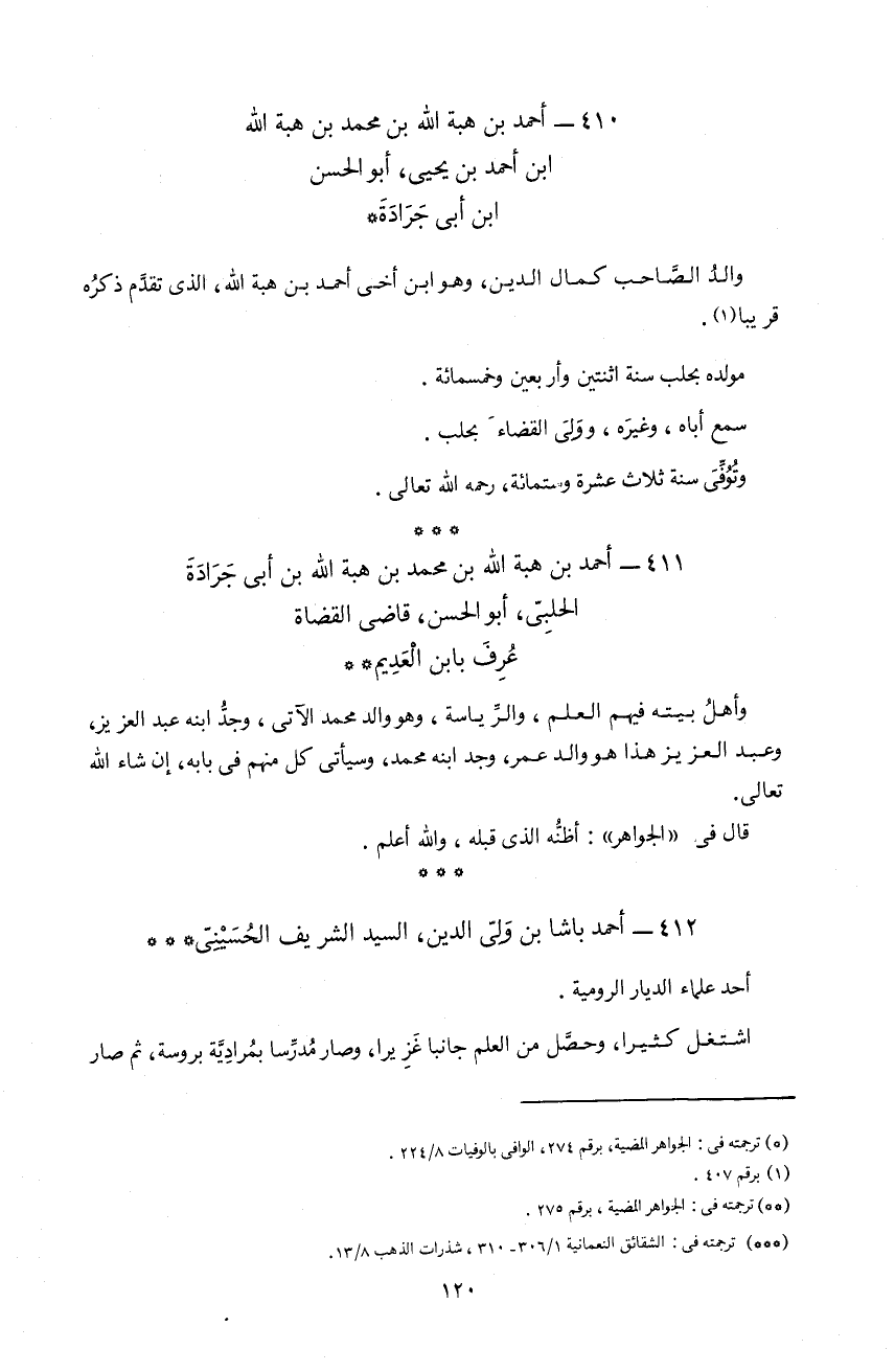 411 - أحمد بن هبة اللّه بن محمد بن هبة اللّه بن أبى جرادة الحلبىّ، أبو الحسن، قاضى القضاة عرف بابن العديم **