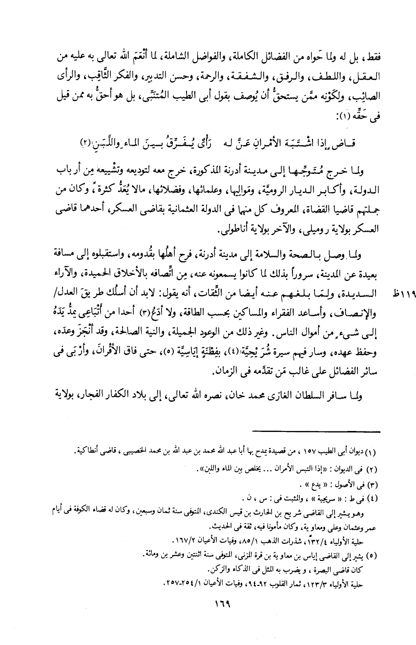 1) ديوان أبى الطيب 157، من قصيدة يمدح بها أبا عبد اللّه محمد بن عبد اللّه بن محمد الخصيبى، قاضى أنطاكية.