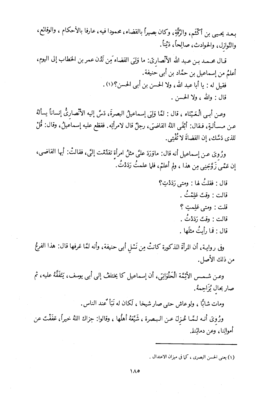 185 بعد يحيى بن أكثم، و الرّقّة، و كان بصيرا بالقضاء، محمودا فيه، عارفا بالأحكام، و الوقائع، و النّوازل، و الحوادث، صالحا، ديّنا.