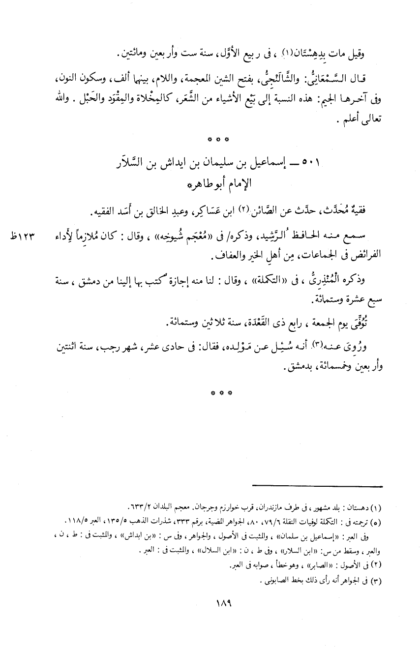 *) ترجمته فى: التكملة لوفيات النقلة 6/ 79، 80، الجواهر المضية، برقم 333، شذرات الذهب 5/ 135، العبر 5/ 118. و فى العبر: «إسماعيل بن سلمان»، و المثبت فى الأصول، و الجواهر، و فى س: «بن ابداش»، و المثبت فى: ط، ن، و العبر، و سقط من س: «ابن السلار»، و فى ط، ن: «ابن السلال»، و المثبت فى: العبر.