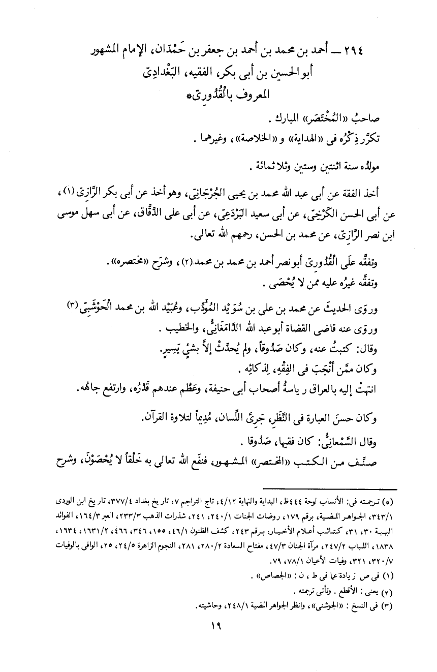 294 - أحمد بن محمد بن أحمد بن جعفر بن حمدان، الإمام المشهور أبو الحسين بن أبى بكر، الفقيه، البغدادىّ المعروف بالقدورىّ *