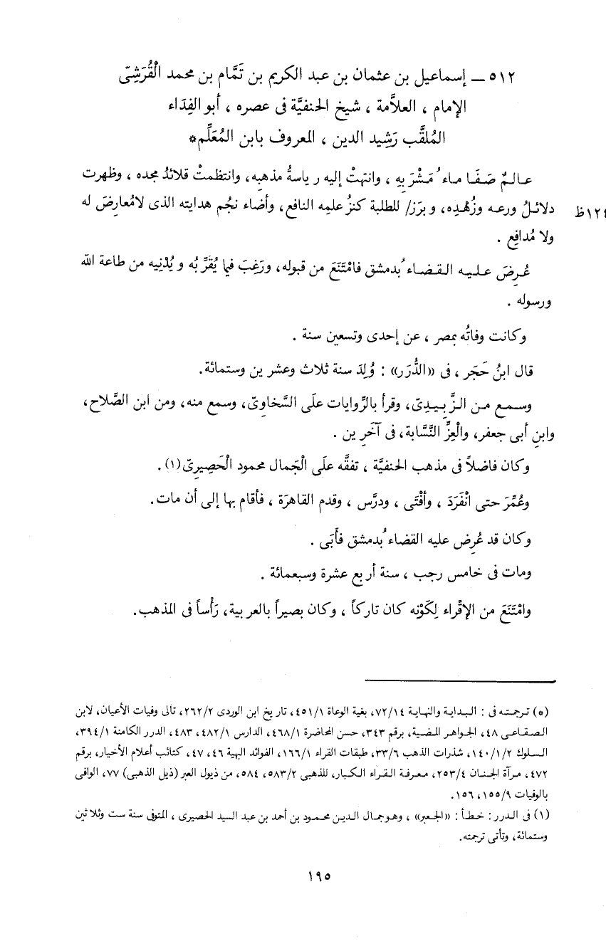 512 - إسماعيل بن عثمان بن عبد الكريم بن تمّام بن محمد القرشىّ الإمام، العلاّمة، شيخ الحنفيّة، فى عصره، أبو الفداء الملقّب رشيد الدين، المعروف بابن المعلّم *