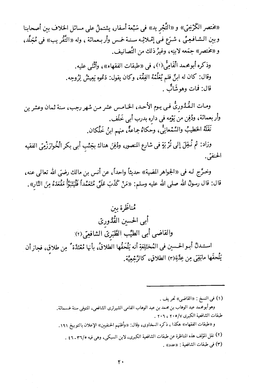 20 «مختصر الكرخىّ» و «التّجريد» فى سبعة أسفار، يشتمل على مسائل الخلاف بين أصحابنا و بين الشافعىّ، شرع فى إملائه سنة خمس و أربعمائة، و له «التّقريب» فى مجلّد، و «مختصر» جمعه لابنه، و غير ذلك من التّصانيف.