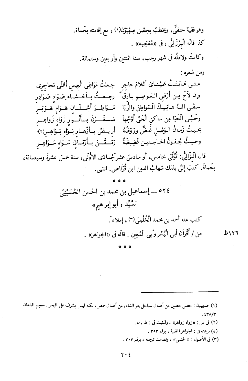 204 و هو فقيه حنفىّ، و يخطب بحصن صهيون 1، مع إقامته بحماة.