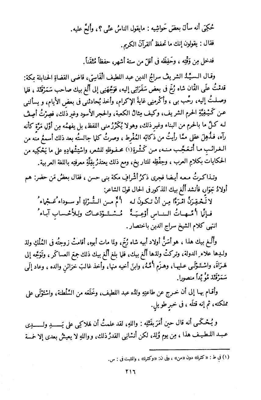و تذاكرت معه أيضا فجرى ذكر أشراف مكة بنى حسن، فقال بعض من حضر: هم أولاد جوار، فأنشد ألغ بيك المذكور فى الحال قول الشاعر: