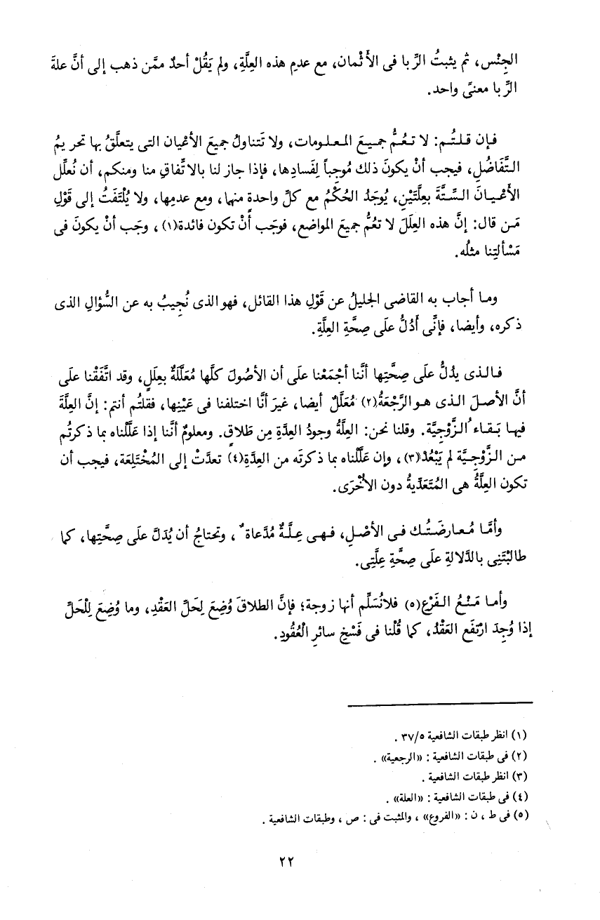 فإن قلتم: لا تعمّ جميع المعلومات، و لا تتناول جميع الأعيان التى يتعلّق بها تحريم التّفاضل، فيجب أن يكون ذلك موجبا لفسادها، فإذا جاز لنا بالاتّفاق منا و منكم، أن نعلّل الأعيان السّتّة بعلّتين، يوجد الحكم مع كلّ واحدة منهما، و مع عدمها، و لا يلتفت إلى قول من قال: إنّ هذه العلل لا تعمّ جميع المواضع، فوجب أن تكون فائدة 1، وجب أن يكون فى مسألتنا مثله.