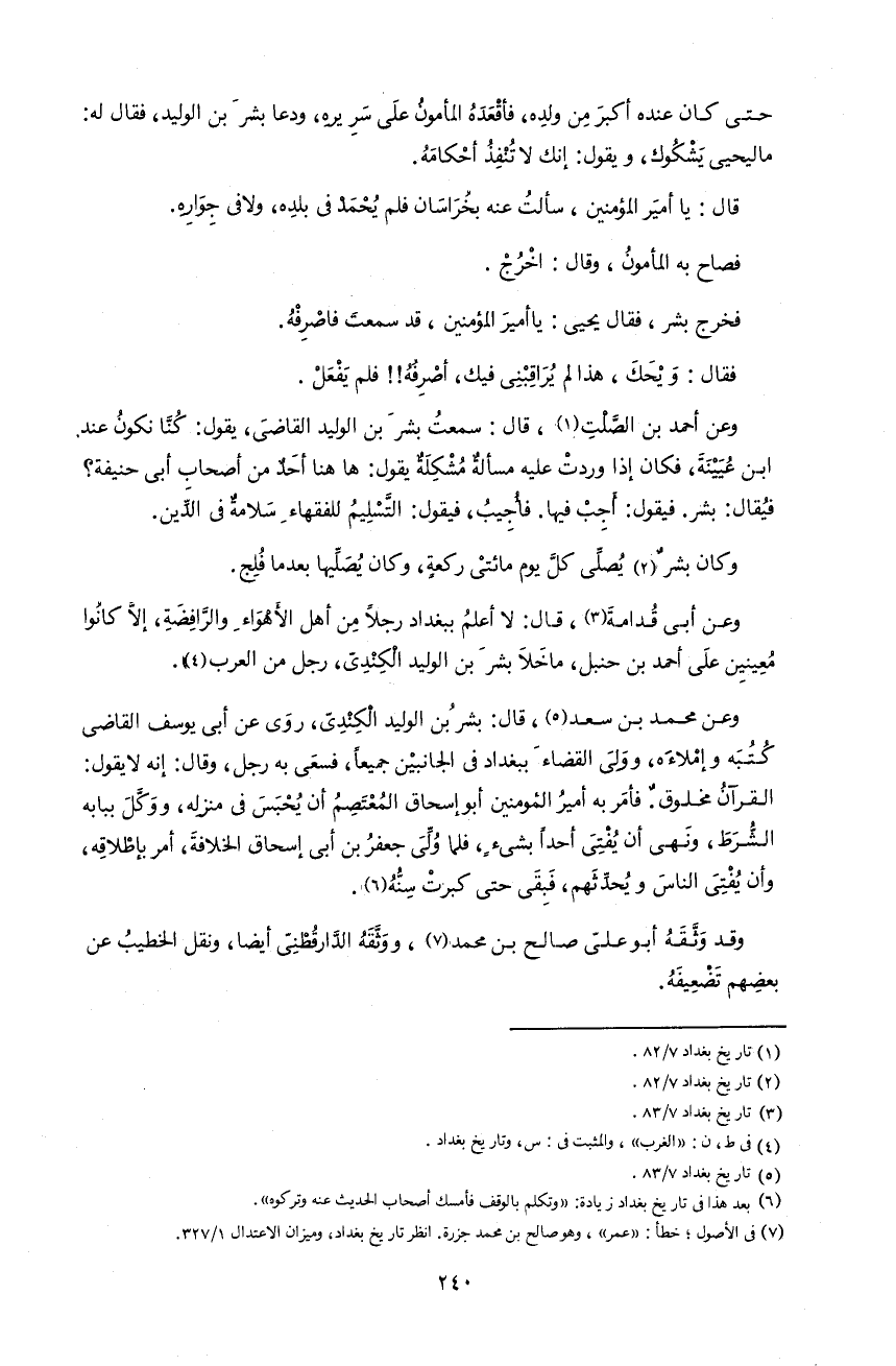 و عن أبى قدامة 3، قال: لا أعلم ببغداد رجلا من أهل الأهواء و الرّافضة، إلاّ كانوا معينين على أحمد بن حنبل، ما خلا بشر بن الوليد الكندىّ، رجل من العرب 4.