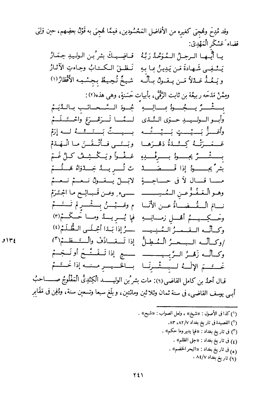 241 و قد مدح و هجى كغيره من الأفاضل المحسودين، فممّا هجى به قول بعضهم، حين ولى قضاء عسكر المهدىّ: