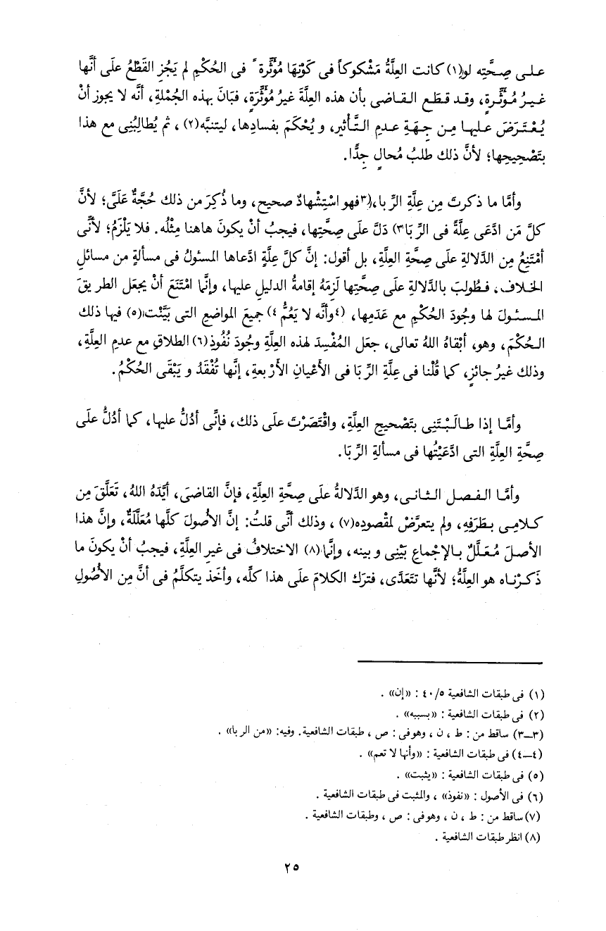 و أمّا ما ذكرت من علّة الرّبا، 3 فهو استشهاد صحيح، و ما ذكر من ذلك حجّة علىّ؛ لأنّ كلّ من ادّعى علّة فى الرّبا 3 دلّ على صحّتها، فيجب أن يكون هاهنا مثله. فلا يلزم؛ لأنّى أمتنع من الدّلالة على صحّة العلّة، بل أقول: إنّ كلّ علّة ادّعاها المسئول فى مسألة من مسائل الخلاف، فطولب بالدّلالة على صحّتها لزمه إقامة الدليل عليها، و إنّما امتنع أن يجعل الطريق المسئول لها وجود الحكم مع عدمها، 4 و أنّه لا يعمّ 4 جميع المواضع التى بيّنت 5 فيها ذلك الحكم، و هو، أبقاه الله تعالى، جعل المفسد لهذه العلّة وجود نفوذ 6 الطلاق مع عدم العلّة، و ذلك غير جائز، كما قلنا فى علّة الرّبا فى الأعيان الأربعة، إنّها تفقد و يبقى الحكم.