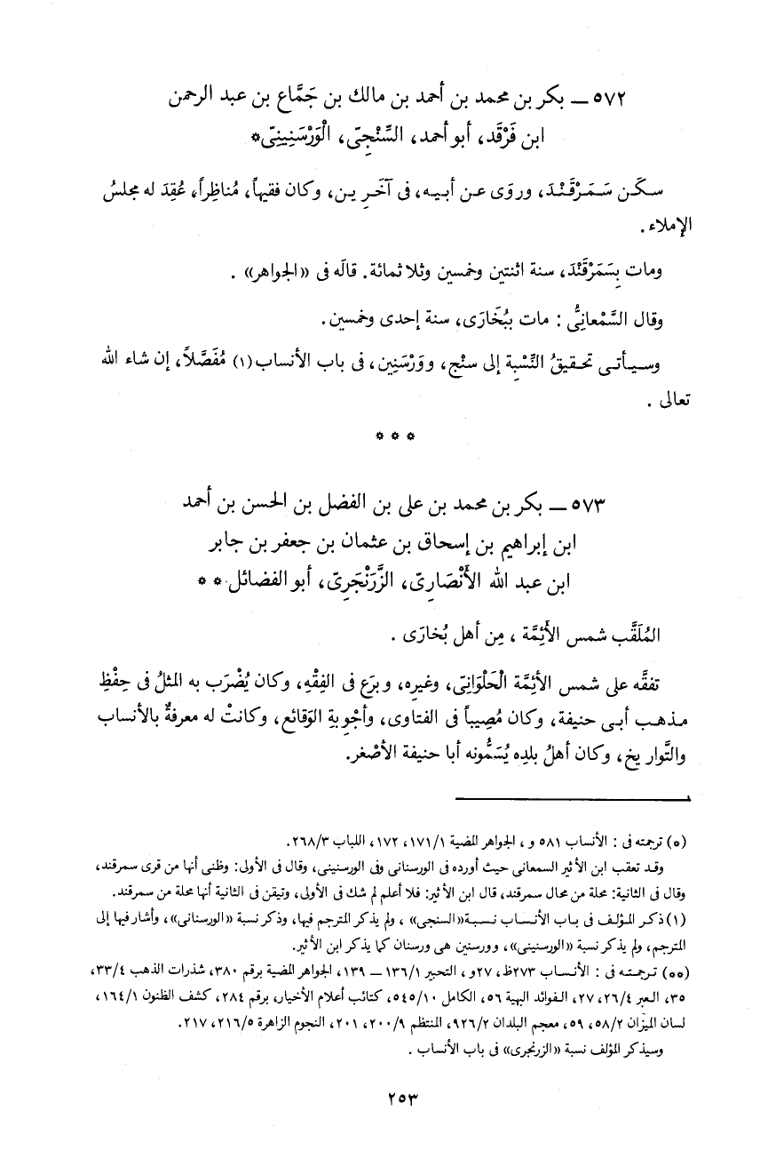 **) ترجمته فى: الأنساب 273 ظ، 27 و، التحبير 1/ 136 - 139، الجواهر المضية برقم 380، شذرات الذهب 4/ 33، 35، العبر 4/ 26، 27، الفوائد البهية 56، الكامل 10/ 545، كتائب أعلام الأخيار، برقم 284، كشف الظنون 1/ 164، لسان الميزان 2/ 58، 59، معجم البلدان 2/ 926، المنتظم 9/ 200، 201، النجوم الزاهرة 5/ 216، 217. و سيذكر المؤلف نسبة «الزرنجرى» فى باب الأنساب.
