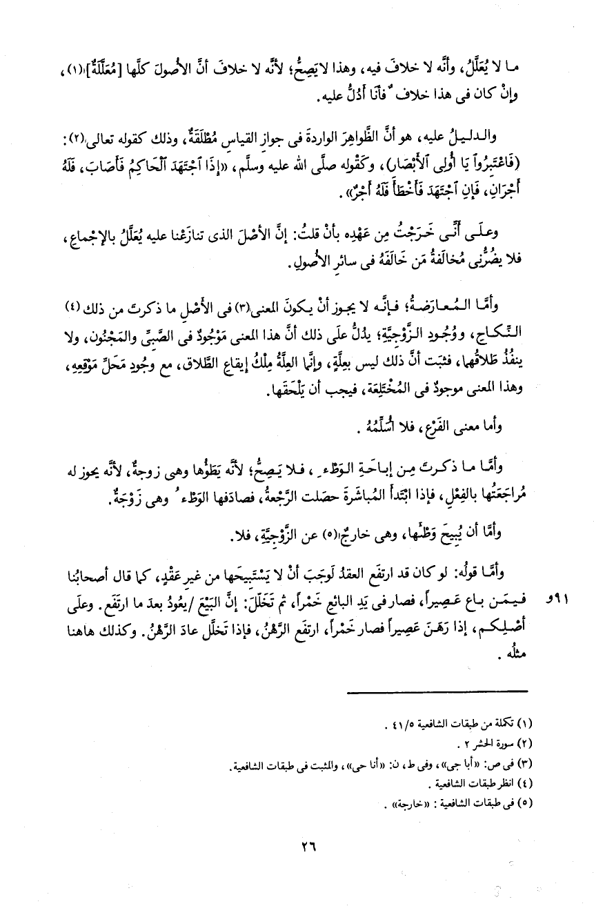 26 ما لا يعلّل، و أنّه لا خلاف فيه، و هذا لا يصحّ؛ لأنّه لا خلاف أنّ الأصول كلّها [معلّلة] 1، و إن كان فى هذا خلاف فأنا أدلّ عليه.