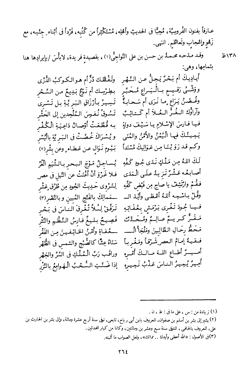 264 عارفا بفنون الفروسيّة، محبّا فى الحديث و أهله، مستكثرا من كتبه، فردا فى أبناء جنسه، مع زهو و إعجاب و تعاظم. انتهى.