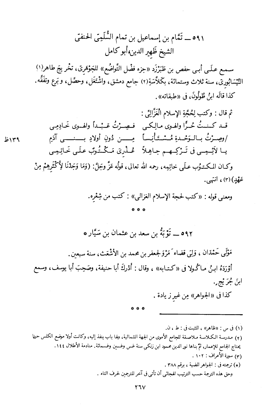 591 - تمّام بن إسماعيل بن تمام السّلمىّ الحنفىّ الشيخ ظهير الدين، أبو كامل