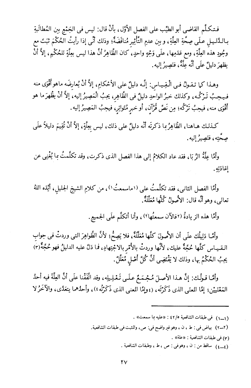27 فتكلّم القاضى أبو الطيّب على الفصل الأوّل، بأن قال: ليس فى الجمع بين المطالبة بالدّليل على صحّة العلّة، و بين عدم التّأثير مناقضة؛ و ذلك أنّى إذا رأيت الحكم ثبت مع وجود هذه العلّة، و مع عدمها، على وجه واحد، كان الظّاهر أنّ هذا ليس بعلّة للحكم، إلاّ أن يظهر دليل على أنّه علّة، فنصير إليه.