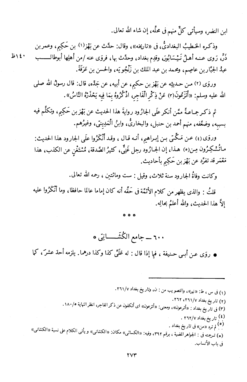 ثم ذكر جماعة ممّن أنكر على الجارود رواية هذا الحديث عن بهز بن حكيم، و تكلّم فيه بسببه، و ضعّفه، منهم أحمد بن حنبل، و البخارىّ، و ابن المدينىّ، و غيرهم.