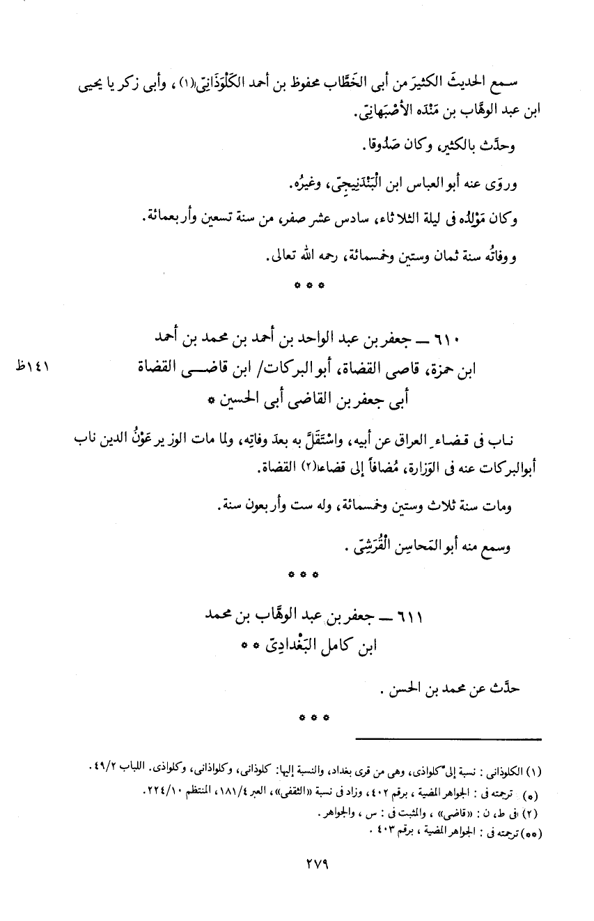 610 - جعفر بن عبد الواحد بن أحمد بن محمد بن أحمد ابن حمزة، قاضى القضاة، أبو البركات/ابن قاضى القضاة أبى جعفر بن القاضى أبى الحسين *