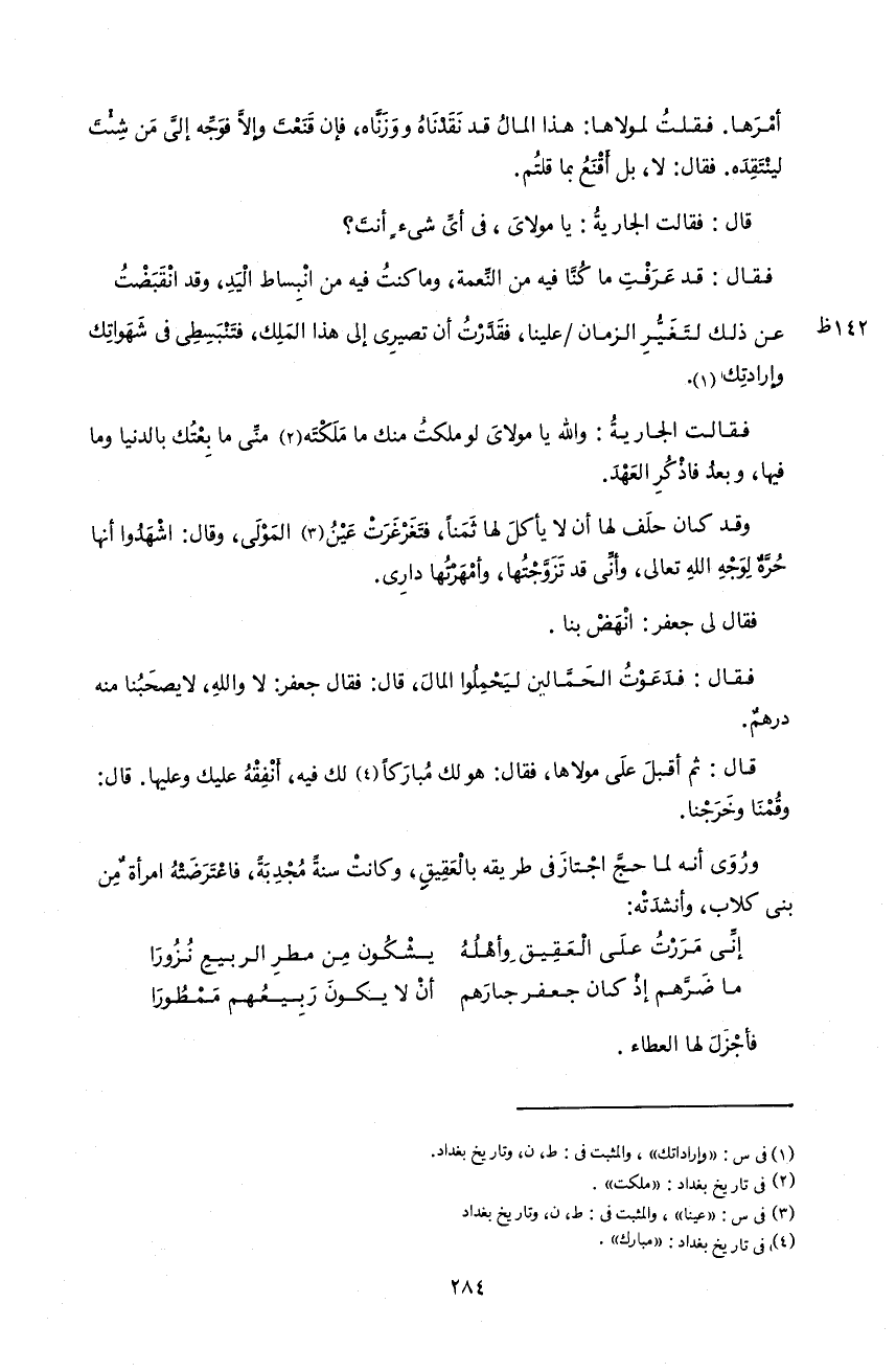 فقال: قد عرفت ما كنّا فيه من النّعمة، و ما كنت فيه من انبساط اليد، و قد انقبضت عن ذلك لتغيّر الزمان/علينا، فقدّرت أن تصيرى إلى هذا الملك، فتنبسطى فى شهواتك و إرادتك 1.