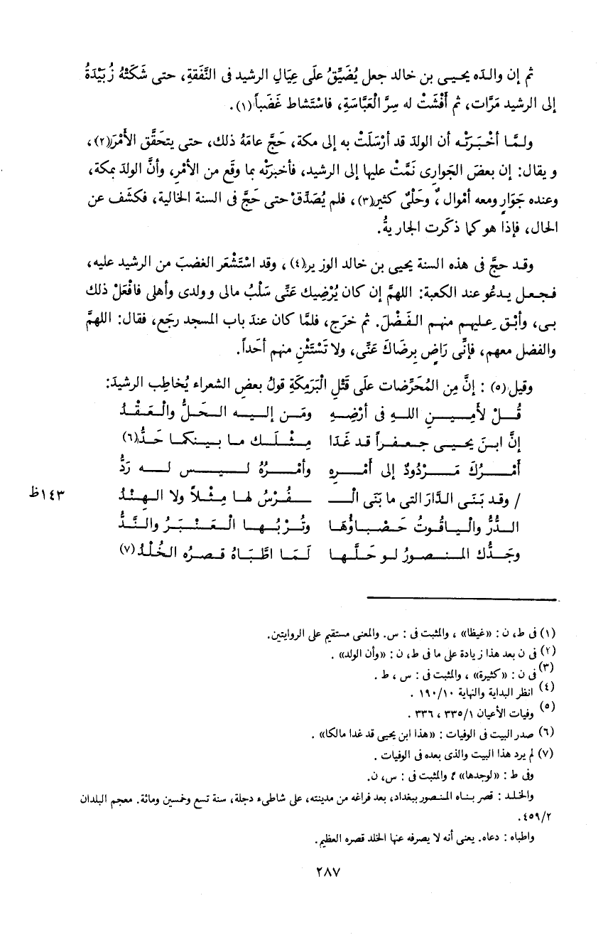 287 ثم إن والده يحيى بن خالد جعل يضيّق على عيال الرشيد فى النّفقة، حتى شكته زبيدة إلى الرشيد مرّات، ثم أفشت له سرّ العبّاسة، فاستشاط غضبا 1.