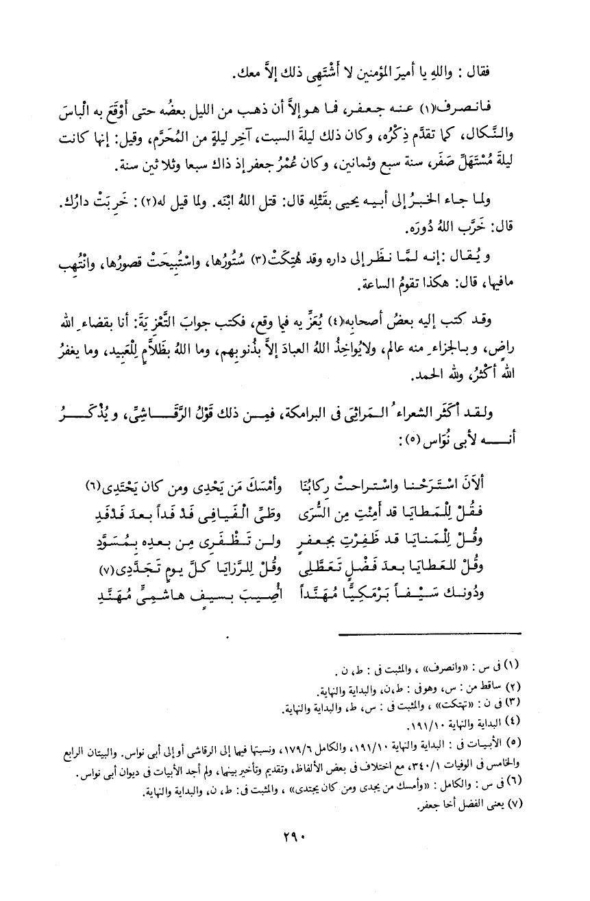 5) الأبيات فى: البداية و النهاية 10/ 191، و الكامل 6/ 179، و نسبتها فيما إلى الرقاشى أو إلى أبى نواس. و البيتان الرابع و الخامس فى الوفيات 1/ 340، مع اختلاف فى بعض الألفاظ، و تقديم و تأخير بينهما، و لم أجد الأبيات فى ديوان أبى نواس.