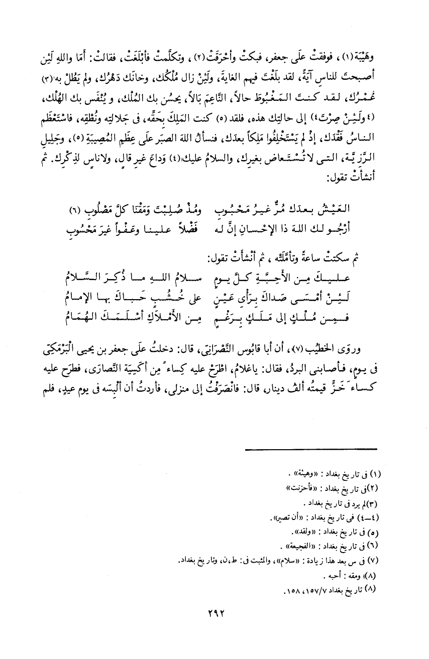292 و هيبة 1، فوفقت على جعفر، فبكت و أحرقت 2، و تكلّمت فأبلغت، فقالت: أما و الله لئن أصبحت للناس آية، لقد بلغت فيهم الغاية، و لئن زال ملكك، و خانك دهرك، و لم يطل به 3 عمرك، لقد كنت المغبوط حالا، النّاعم بالا، يحسن بك الملك، و ينفس بك الهلك، 4 و لئن صرت 4 إلى حالتك هذه، فلقد 5 كنت الملك بحقّه، فى جلالته و نطقه، فاستعظم الناس فقدك، إذ لم يستخلفوا ملكا بعدك، فنسأل الله الصبر على عظم المصيبة 5، و جليل الرّزيّة، التى لا تستعاض بغيرك، و السلام عليك 6 و داع غير قال، و لا ناس لذكرك. ثم أنشأت تقول: