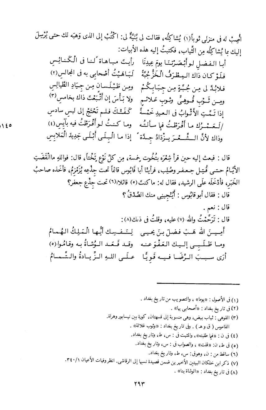 293 أصب له فى منزلى ثوبا 1 يشاكله، فقالت لى بنيّة لى: اكتب إلى الذى وهبه لك حتى يرسل إليك بما يشاكله من الثّياب، فكتبت إليه هذه الأبيات: