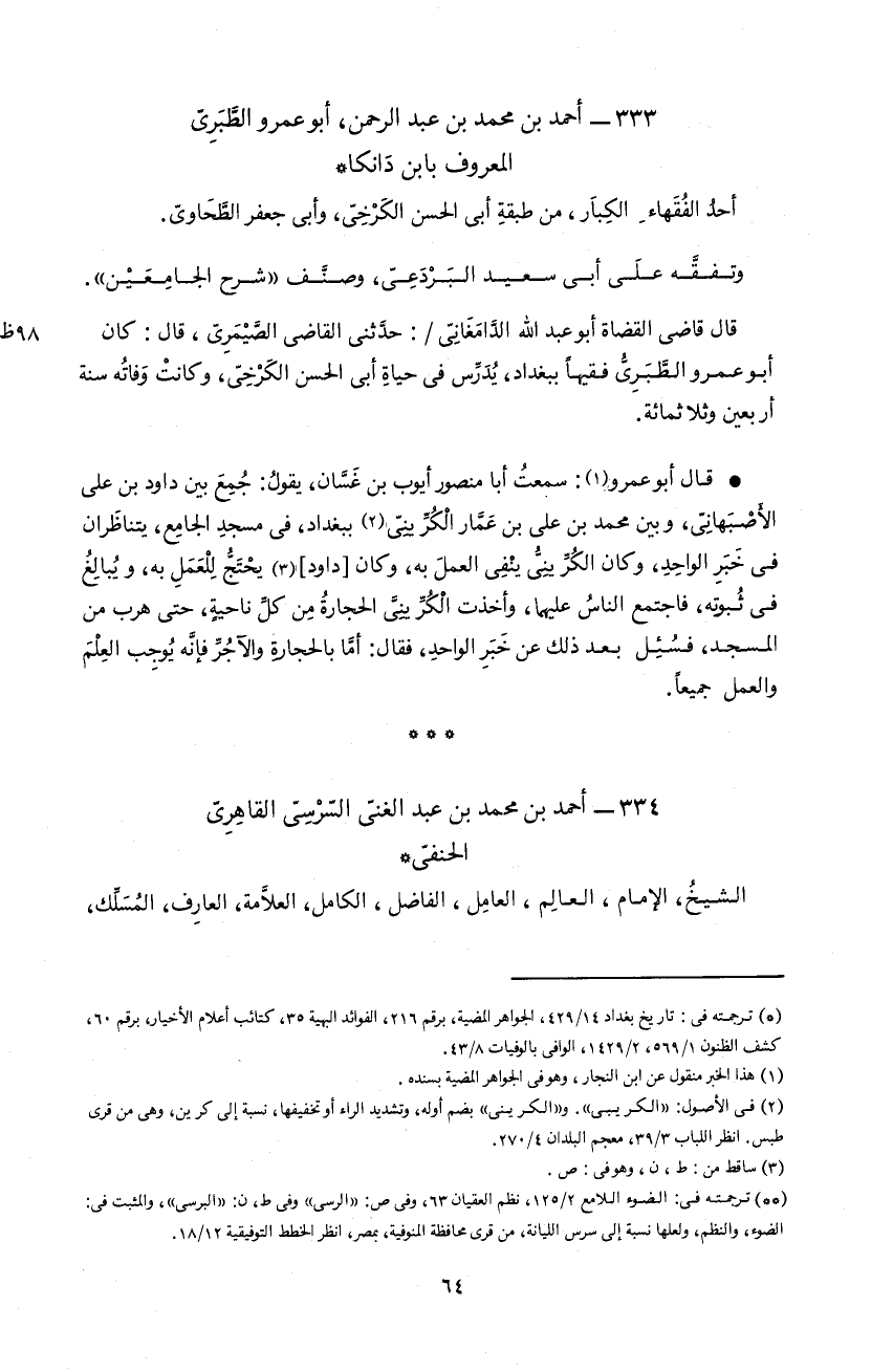 *) ترجمته فى: تاريخ بغداد 14/ 429، الجواهر المضية، برقم 216، الفوائد البهية 35، كتائب أعلام الأخيار، برقم 60، كشف الظنون 1/ 569، 2/ 1429، الوافى بالوفيات 8/ 43.
