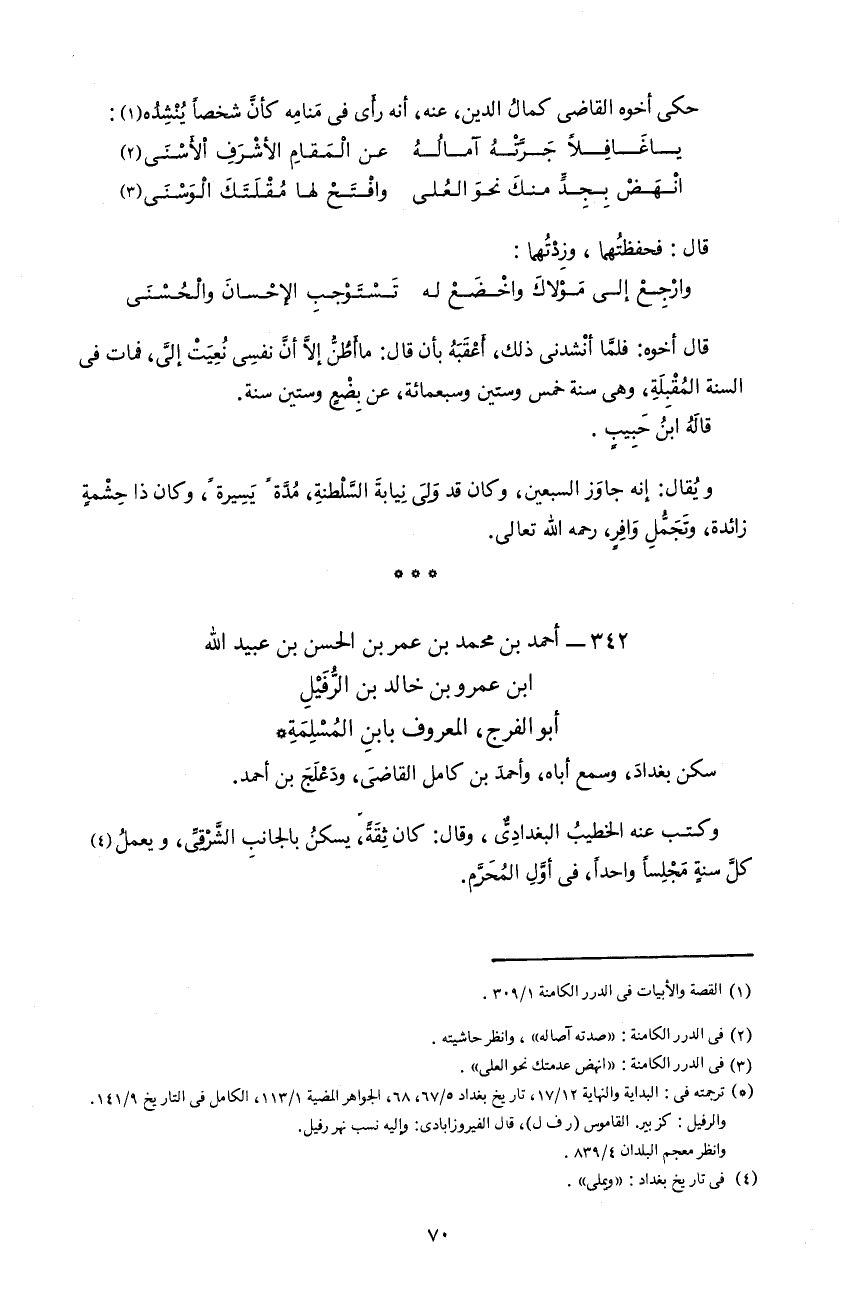 70 حكى أخوه القاضى كمال الدين، عنه، أنه رأى فى منامه كأنّ شخصا ينشده 1: