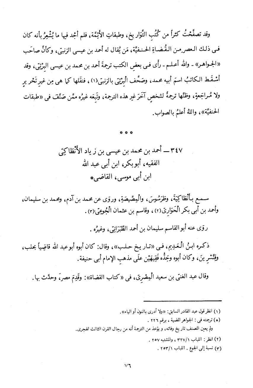 76 و قد تصفّحت كثرا من كتب التّواريخ، و طبقات الأئمّة، فلم أجد فيها ما يشعر بأنه كان فى ذلك العصر من القضاة الحنفيّة، من يقال له أحمد بن عيسى الزنبىّ، و كأنّ صاحب «الجواهر» -و اللّه أعلم-رأى فى بعض الكتب ترجمة أحمد بن محمد بن عيسى البرتىّ، و قد أسقط الكاتب اسم أبيه محمد، و صحّف البرتىّ بالزنبىّ 1، فنقلها كما هى من غير تحرير و لا مراجعة، و ظنّها ترجمة لشخص آخر غير هذه الترجمة، و تبعه غيره ممّن صنّف فى «طبقات الحنفيّة»، و اللّه أعلم بالصواب.