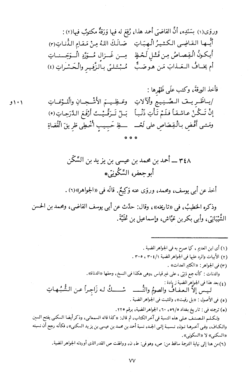 *) ترجمته فى: تاريخ بغداد 5/ 59، 60، الجواهر المضية، برقم 225. و تكلم المصنف على هذه النسبة فى آخر الكتاب، ثم قال: «كذا قاله السمعانى، و ذكر أيضا السكنى يفتح السين و الكاف، و فى آخرها نون، نسبة إلى الجد، نسبة أحمد بن محمد بن عيسى بن يزيد السكنى»، فكأنه رجح أن نسبة «السكنى» لا «السكونى».