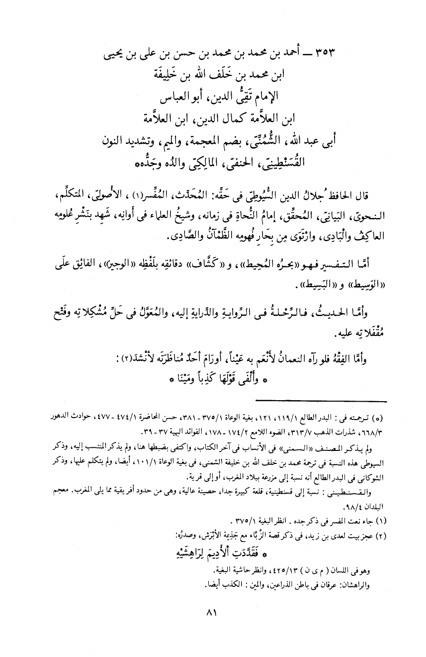 *) ترجمته فى: البدر الطالع 1/ 119، 121، بغية الوعاة 1/ 375 - 381، حسن المحاضرة 1/ 474 - 477، حوادث الدهور 3/ 668، شذرات الذهب 7/ 313، الضوء اللامع 2/ 174 - 178، الفوائد البهية 37 - 39. و لم يذكر المصنف «السمنى» فى الأنساب فى آخر الكتاب، و اكتفى بضبطها هنا، و لم يذكر المنتسب إليه، و ذكر السيوطى هذه النسبة فى ترجمة محمد بن خلف اللّه بن خليفة الشمنى، فى بغية الوعاة 1/ 101، أيضا، و لم يتكلم عليها، و ذكر الشوكانى فى البدر الطالع أنه نسبة إلى مزرعة ببلاد المغرب، أو إلى قرية. و القسنطينى: نسبة إلى قسنطينية، قلعة كبيرة جدا، حصينة عالية، و هى من حدود أفريقية مما يلى المغرب. معجم البلدان 4/ 98.