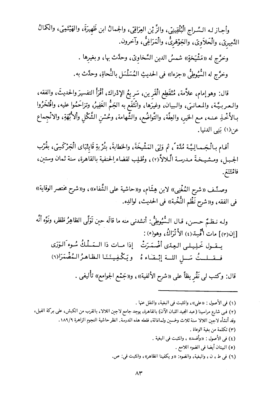 83 و أجاز له السّراج البلقينىّ، و الزّين العراقىّ، و الجمال ابن ظهيرة، و الهيتمىّ، و الكمال الدّميرىّ، و الحلاوىّ، و الجوهرىّ، و المراغىّ، و آخرون.