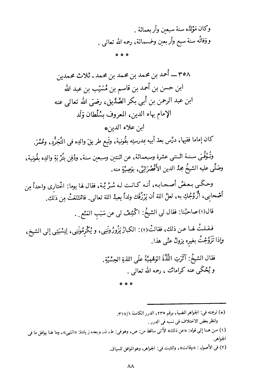 358 - أحمد بن محمد بن محمد بن محمد-ثلاث محمد بن ابن حسن بن أحمد بن قاسم بن مسيّب بن عبد اللّه ابن عبد الرحمن بن أبى بكر الصّدّيق، رضى اللّه تعالى عنه الإمام بهاء الدين، المعروف بسلطان ولد ابن علاء الدين *